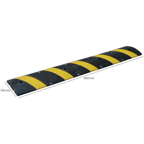 Goed zichtbaar dankzij de brede gele stroken. Zeer robuust rubber. De verkeersdrempel uit één stuk is zeer goed bestand tegen diverse vetten en zuren. Maximale snelheid 10 km/h.