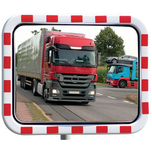 Verkeersspiegel om de veiligheid te verbeteren en gevaren in potentieel gevaarlijke gebieden te verminderen. Zeer resistent: getest tegen harde winden van kracht 12 (orkaan groter dan 117 km/u). Vierpuntsbevestiging voor paal of wand met kogelgewricht, sterker dan een conventionele bevestiging. Zwart/wit frame om de aandacht van bestuurders te trekken. Rvs uitvoering: bestand tegen hoge temperaturen Gemaakt in de EU
