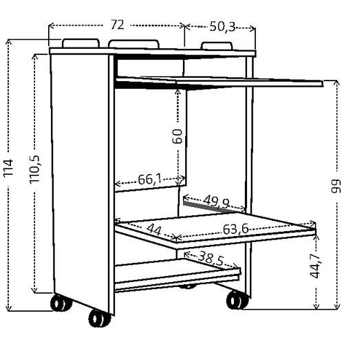 | Productnaam | Verrijdbaar computermeubel, Tafelblad kleur: Grijs, Aantal legborden: 4, Totale breedte: 72 cm |