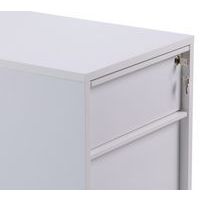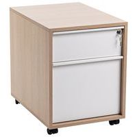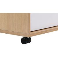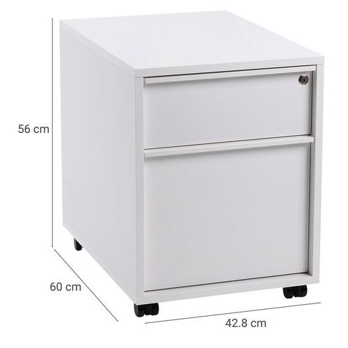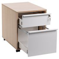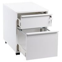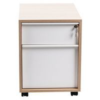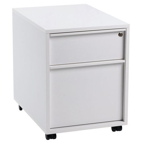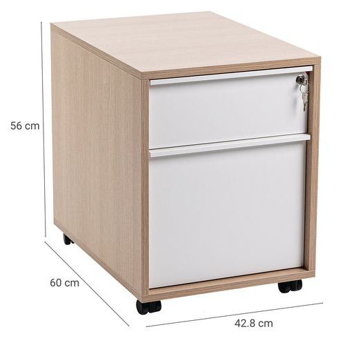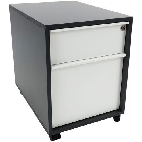 Verrijdbaar ladeblok Misao van melamine met randen van 1 mm. 2 laden van melaminepaneel waarvan één voor hangmappen. De werkhoogtes van de laden zijn 14,5 cm en 27,7 cm, voor een werkbreedte van 32,5 cm. Lade voor hangmappen, geschikt voor A4-mappen en foolscap. Centrale vergrendeling zonder kantelbeveiliging. Handgreep van geprofileerd en geanodiseerd aluminium. Maximale belasting voor elke lade: 25 kg. Zwenkwielen met een diameter van 37 mm.