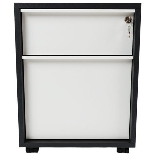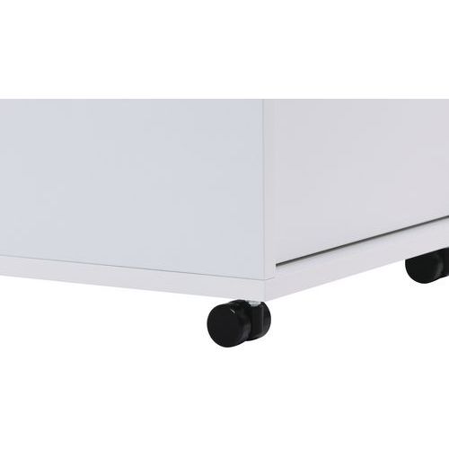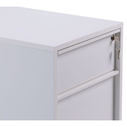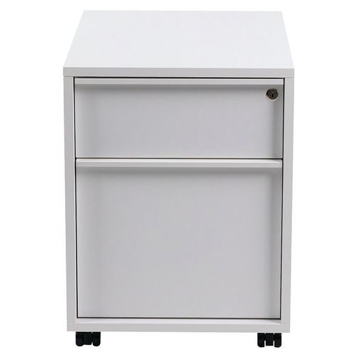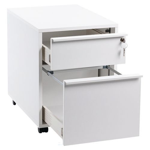 Verrijdbaar ladeblok Misao van melamine met randen van 1 mm. 2 laden van melaminepaneel waarvan één voor hangmappen. De werkhoogtes van de laden zijn 14,5 cm en 27,7 cm, voor een werkbreedte van 32,5 cm. Lade voor hangmappen, geschikt voor A4-mappen en foolscap. Centrale vergrendeling zonder kantelbeveiliging. Handgreep van geprofileerd en geanodiseerd aluminium. Maximale belasting voor elke lade: 25 kg. Zwenkwielen met een diameter van 37 mm. Gemaakt in de EU Klantgarantie : 10 jaar