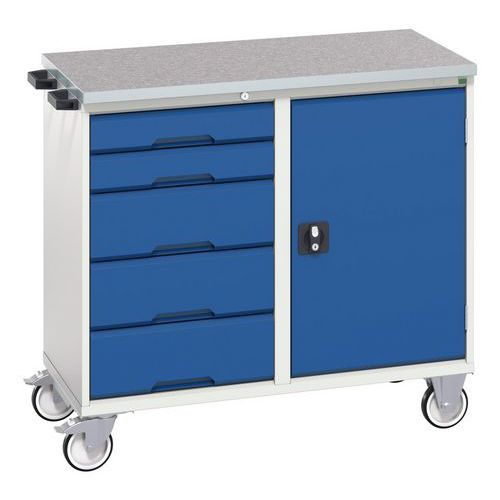 Constructie van gelast plaatstaal Het vak met deur is uitgerust met een legbord van gegalvaniseerd staal, in hoogte verstelbaar Draagvermogen per legbord 60 kg Laden kunnen 100% geopend worden, belasting 50 kg Beveiligingsmechanisme dat ervoor zorgt dat de laden niet per ongeluk opengaan. Handgreep 4 wielen met een diameter van 125 mm, 2 bokwielen en 2 zwenkwielen met rem Maximaal toelaatbare belasting 200 kg Breedte 1050 mm Hoogte 980 mm, diepte 600 mm met tafelblad dikte 30 mm Hoogte 965 mm, diepte 550 mm met bovenkant met 3 opstaande randen Gemaakt in het UK Max. belasting (kg) : 300