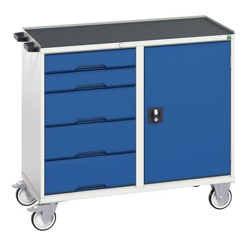 Constructie van gelast plaatstaal Het deurvak is voorzien van een in hoogte verstelbaar gegalvaniseerd stalen plank Belasting per tablet 60 kg Lade openen op 100%, belasting 50 kg Veiligheidsmechanisme om te voorkomen dat laden per ongeluk worden geopend Handgreep 4 wielen diameter 125mm, 2 vaste en 2 zwenkbare remmen Maximaal toelaatbare belasting 200 kg Breedte 1050 mm Hoogte 980 mm, diepte 600 mm met 30 mm dikte blad Hoogte 965 mm, diepte 550 mm met top 3 randen