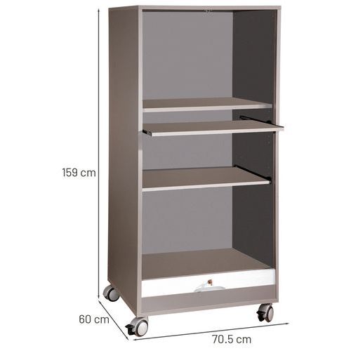 | Productnaam | Verrijdbare computerkast met rolluik, Tafelblad kleur: Grijs, Totale breedte: 70.5 cm, Totale diepte: 60 cm |