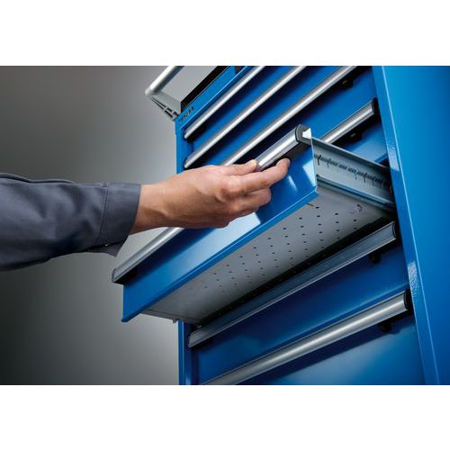 Grote stabiliteit van het geheel met een draagvermogen tot 4 t, laden met een draagvermogen tot 75 of 200 kg Optimaal gebruik dankzij de totale uitbreiding en de optimale hoogte aan de voorzijde van de laden Uitstekende bescherming tegen stof, vloeistoffen en mechanische slijtage dankzij een gesloten geheel met een oppervlak dat bestand is tegen schokken en slijtage Onfeilbare veiligheid met anti-losmaaksysteem dat voorkomt dat de lade eruit valt en met individuele ladeblokkering (antikantelbeveiliging) Bescherming tegen corrosie dankzij een elektrostatische dompellak en spuitlak Optimale opbergmogelijkheden en organisatie dankzij het materiaal voor indeling van LISTA, geschikt voor elke toepassing en dankzij de laden die zijn voorzien van uitsparingen en perforaties Professionele etikettering met de etiketteersoftware van LISTA Script en de inklapbare grijpstang voor de invoering van etiketten Perfect stille verplaatsing dankzij de rail zonder verbindingsstuk Max. belasting (kg) : 75 kg