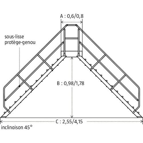 Verstevigingsstang onder het platform voor meer mobiliteit. Loopbrug met 2 leuningen. Treden zijn aan de lijsten geschroefd. Product gefabriceerd in Frankrijk.