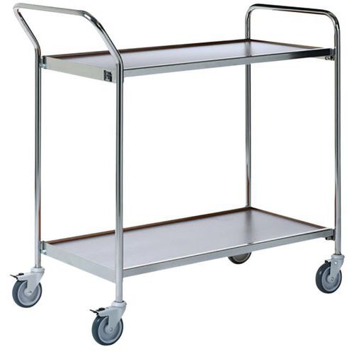 Verrijdbare tafel met grijze structuur - 2 plateaus met transporthandgreep en buisvormige beugel. Buisvormige randen van 22 mm en dikte plateau 12 mm. Maximale belasting per plateau is 100 kg. Uitgerust met 4 zwenkwielen waarvan 2 met rem.