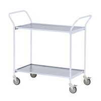 Verrijdbare tafel met grijze afwerking, 2 plateaus en 2 handgrepen. Robuust blad met rand van 25x20 mm en een dikte van 12 mm. Voorzien van 4 zwenkwielen Ø 100 mm waarvan 2 met rem, grijze rubberen banden.