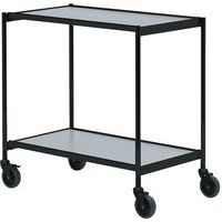 Verrijdbare tafel zonder transporthandgreep, met zwarte afwerking en 2 plateaus. Robuust blad met rand van 25x20 mm en een dikte van 12 mm. Voorzien van 4 zwenkwielen Ø 100 mm waarvan 2 met rem, grijze rubberen banden. Gemaakt in de EU Max. belasting (kg) : 150 kg