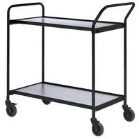 Verrijdbare tafel met zwarte structuur - 2 plateaus met transporthandgreep en buisvormige beugel. Buisvormige randen van 22 mm en dikte plateau 12 mm. Maximale belasting per plateau is 100 kg. Uitgerust met 4 zwenkwielen waarvan 2 met rem.