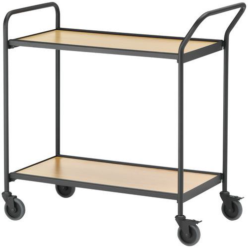 Verrijdbare tafel met zwarte structuur - 2 plateaus met transporthandgreep en buisvormige beugel. Buisvormige randen van 22 mm en dikte plateau 12 mm. Maximale belasting per plateau is 100 kg. Uitgerust met 4 zwenkwielen waarvan 2 met rem. Gemaakt in de EU Max. belasting (kg) : 150