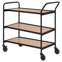 Verrijdbare tafel met zwarte structuur, 3 plateaus met transporthandgreep en buisvormige beugel. Buisvormige randen van 22 mm en dikte plateau 12 mm. Maximale belasting per plateau is 100 kg. Uitgerust met 4 zwenkwielen waarvan 2 met rem.