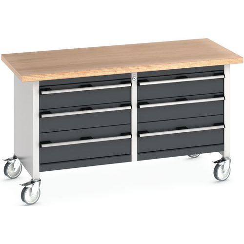 Compacte en mobiele werkbank met stevig werkblad van multiplex. Bewaar uw spullen op een veilige plaats in de 6 lades met een centraal slot. De lades zijn uitschuifbaar tot 100 %. Werkbank met 4 rubberen zwenkwielen (waarvan 2 met rem).