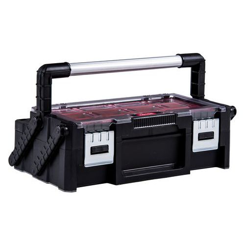 Niet-verstelbare verschuifbare organizer. Afsluitbaar doorzichtig deksel. Met vakken met metalen klemmen. Twee kunststof bakken met 18 niet-verstelbare vakken voor klein materiaal. Doorzichtig deksel afsluitbaar met metalen klemmen. Eenvoudig te hanteren dankzij de handgreep.
