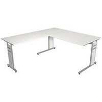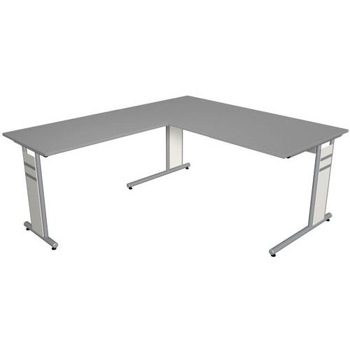 Compact bureau met retour en draagarmframe. Een verticale kabelgoot aan de binnenkant van de poten van het bureau. Bureaublad van gemelamineerd hout klasse E1 met randen van ABS (2 mm). Bureaublad van 19 mm dik. Zijpaneel met verticale witte kabels en zilverkleurige strips.