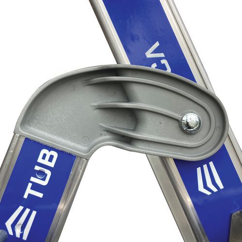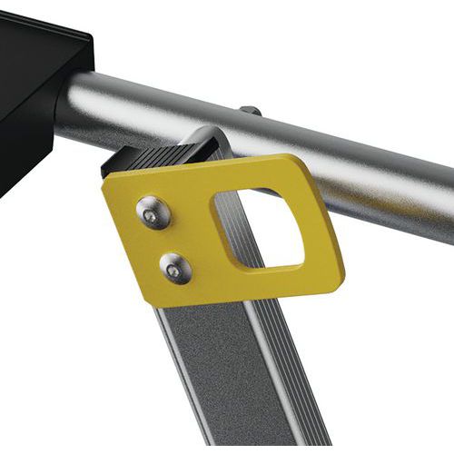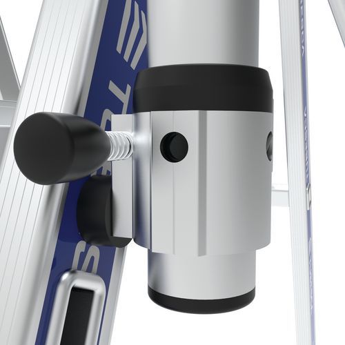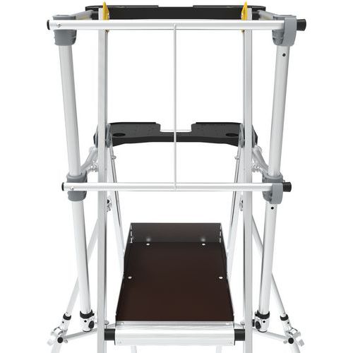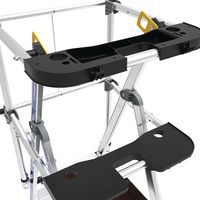 Verstelbaar platform Sherpascopic. Stevige reling aan 4 kanten met liggers voor valbeveiliging met semi-automatische sluiting. Antisliptreden van 80 mm. Verwijderbare gereedschapshouder met vakindeling, belasting van 25 kg, met geïntegreerde haken (max. 10 kg). XL-legbord, belastbaar tot 25 kg. Platform 590 x 400 mm, comfortabel met antislipvloer van hout uit duurzame bronnen. Ergonomische en comfortabele werkruimte. Intrekbare stabilisatoren met afstelling in millimeters. Telescopische delen om de hoogte te verstellen. Intuïtief en veilig systeem voor instelling van de hoogte, verstelbaar per 23 cm (per trede). Het platform telt als één trede.