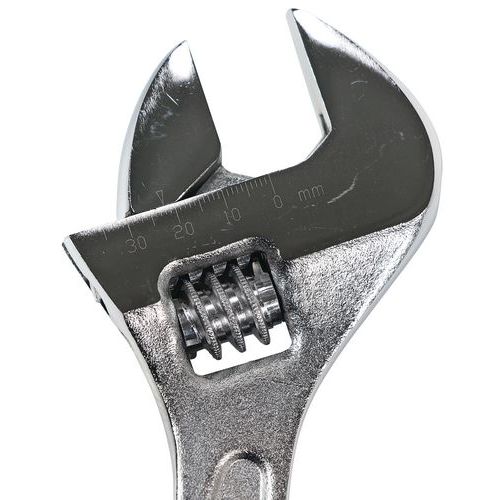 - Verstelbare moersleutel van staal met vanadiumchroom, kleine kop onder een hoek van 15°, tandheugel met niet-uitstekende bek.