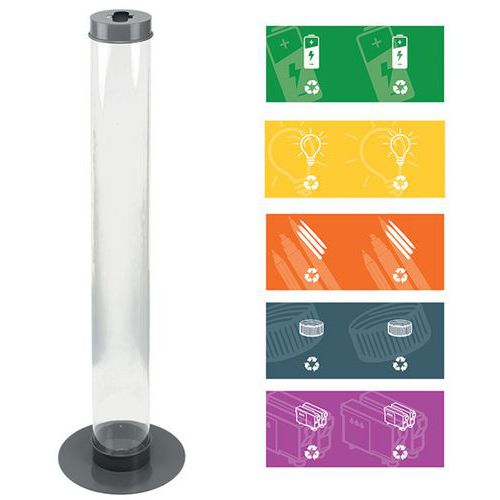 Buis van transparant polycarbonaat. Sokkel van metaal. Absorberende schijf onderaan: sponsschijf die wordt gebruikt om eventueel overvloeiend materiaal dat erin wordt weggegooid, te absorberen. Absorberende schijf in de basis. Permanente visuele controle van de inhoud. Buis van transparant polycarbonaat. Sokkel van metaal. Absorberende schijf onderaan: sponsschijf die wordt gebruikt om eventueel overvloeiend materiaal dat erin wordt weggegooid, te absorberen. Absorberende schijf in de basis. Permanente visuele controle van de inhoud. Vijf stickers met opschrift van het type afval. Gebruikte batterijen, lampen, doppen, schrijfgerei, cartridges.
