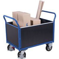 Zwaarlastwagen met 4 wanden 1000 kg Laadhoogte: 295 mm Hoogte kopse wanden en wanden lengterichting: 515 mm (van bovenkant laadvlak) Uitvoering: Duwbeugels van 1Inch buis Laadvlak, kopsw wanden en wanden lengterichting van multiplex, film-/zeefdrukcoating (zeefdrukoppervlak naar boven gericht), waterbestendig verlijmd Wiel van volelastisch rubber op aluminiumdrukgietvelg met precisie kogellager, zwart, diameter 200 mm, 2 zwenkwielen met centrale EasySTOP rem en 2 bokwielen, zwenkwielen met voetbeschermer