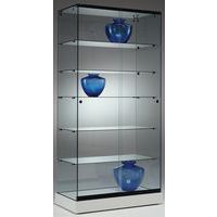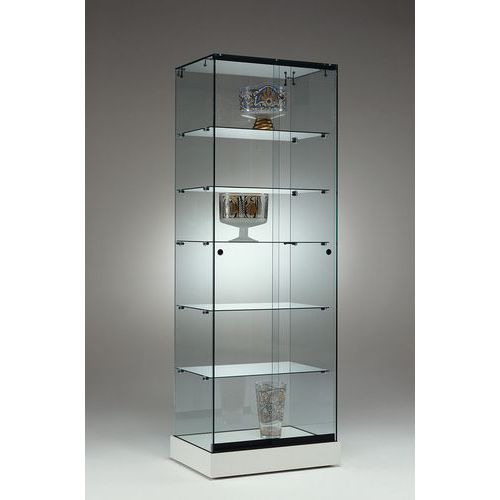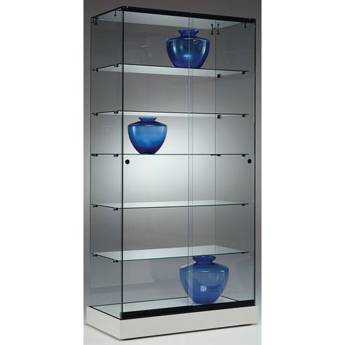 Geheel glazen vitrinekast met zwarte, witte of beuken sokkel.