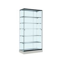 Geheel glazen vitrinekast met zwarte, witte of beuken sokkel.