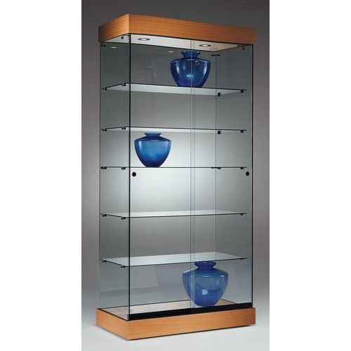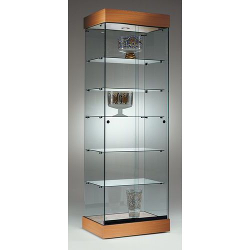 Vitrine, volledig van glas met zwarte, witte of beuken sokkel.