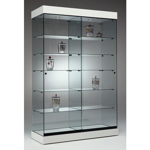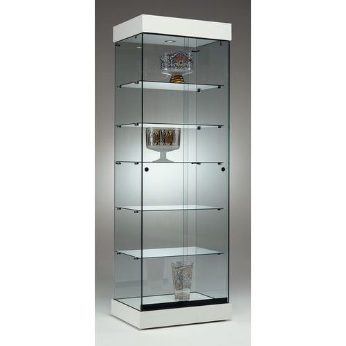 Vitrine, volledig van glas met zwarte, witte of beuken sokkel.