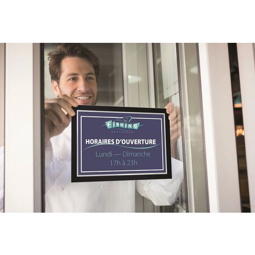 Lijst voor de weergave van prijsdocumenten, openingstijden, acties, enz. Lijst voor mededelingen Duraframe® Sun, speciaal ontworpen voor glazen oppervlakken waar de zon op schijnt. Dankzij de vitrostatische bevestiging kan de lijst op vitrines, ramen, enz. worden bevestigd. Snel plaatsen en verwisselen van de affiche dankzij de magnetische omlijsting. Hittebestendig (tot 70°C) en is voorzien van een UV-bestendige laag die tot 2 jaar blijft zitten.