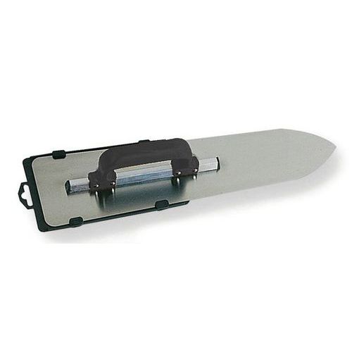Troffel voor één hand voor het gladmaten van beton. Ook ‘Vlaamse’ troffel genoemd. KENMERKEN: Hoek van het blok afgerond. Licht dankzij het frame van aluminium profiel. Ergonomisch dankzij het kunststof, gesloten handvat, bevestigd met 4 klinknagels. Puntige teen. Dikte stalen lemmet: 1 mm. Beschermhoes voor het mes en ophanging aan een pen.