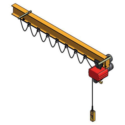 Voedingskabels op staalkabel voor hijsbalk aan wanden en op sokkel Voedingskabels op staalkabel voor hijsbalk aan wanden en op sokkel