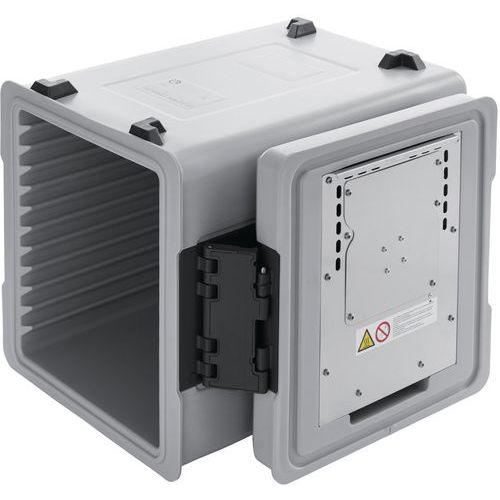 BLANCOTHERM 420 KBRUH Voedseltransport box van kunststof, circulatieluchtverwarmd, met digitale thermostaat voor regeling per graad van de inwendige temperatuur van +40 °C tot +85 °C, met draaideur Capaciteit: 2x GN 1/1-150 of onderverdelingen daarvan Aantal geleiders: 11 paar geleiders Geleiderafstand: 31 mm Gemaakt in Duitsland