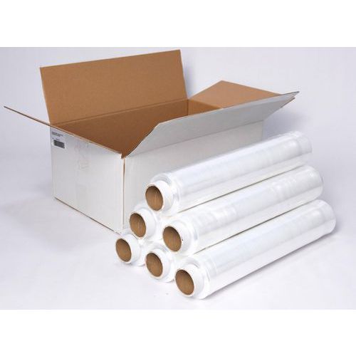 Handmatig voorgerekte rekfolie met een dikte van 6 micron. Deze folie is uitsluitend bestemd voor handmatig gebruik, voor de verpakking van pallets. Cast-folie voor snelle en moeiteloze toepassing. Geen verlies in breedte bij het gebruik. Voorgerekte stille en sterke Cast-folie, lange houder van 600 mm voor een betere grip. Lengte 300 m of 600 m.