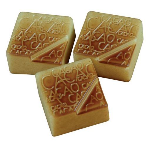 | Productnaam | Vorm voor vierkant praline met tekst ‘cacao’, Hoogte: 1.4 cm, Type: Plaat, Lengte: 2.5 cm |