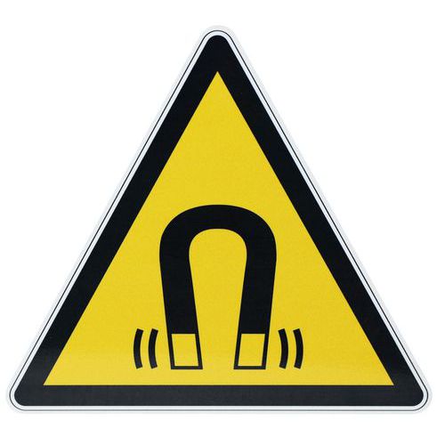 Dit signaalbord met pictogram wijst op de aanwezigheid van een magnetisch veld en wijst tegelijkertijd erop dat moet worden gecontroleerd of voorzorgsmaatregelen zijn genomen.