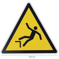 Waarschuwingsbord met pictogram dat waarschuwt voor het risico op vallen door hoogteverschil.