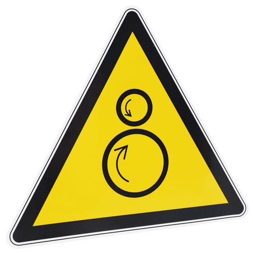 - Dit bord met pictogram is bijzonder geschikt om te wijzen op gevaar door tegenovergesteld draaiende rollen.