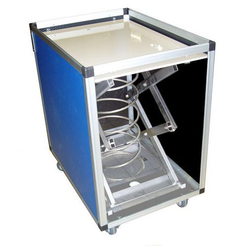 Beweegbare bodem door pantograafsysteem met veer. Bodem verstevigd met een 8 mm dikke polypropyleen plaat. Bestand tegen schokken, temperatuurschommelingen, water en de meeste oliën, vetten en chemicaliën.
