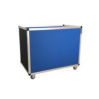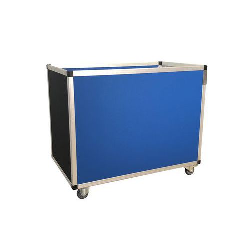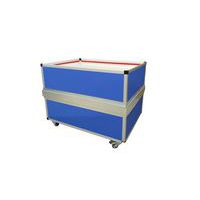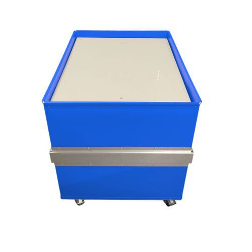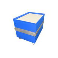 Beweegbare bodem door pantograafsysteem met veer. Bodem verstevigd met een 8 mm dikke polypropyleen plaat. Bestand tegen schokken, temperatuurschommelingen, water en de meeste oliën, vetten en chemicaliën. Model 100 kg: uitgerust met een gegalvaniseerde stalen versterkingsband. Rubberen wielen Ø 80 mm, 2 vast + 2 zwenkwielen met rem. Wanddikte 1,9 mm. Bovenrand naar buiten gevouwen op een gegalvaniseerd stalen verstevigingsframe. Keuze uit kleuren: metaalgrijs, wit, zwart, Osloblauw, Frans blauw, groen, geel, helder rood, bordeaux rood.