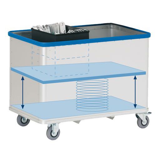Orderverzamelwagen ergonomische Ergo Vario met mobiele bodem om op constante hoogte te werken. Constructie van een legering van geanodiseerd aluminium: sterk en licht. Constante laad- en loshoogte doordat de bodem onder het gewicht van de lading constant wordt gehouden en langzaam omhoog gaat tijdens het lossen van de wagen.