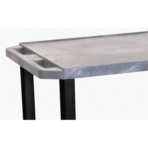 Eenvoudige montage, geen gereedschap nodig. Wagen van stevig gerecycled kunststof, bestand tegen vochtigheid en slechte weersomstandigheden. Plateau met antislipbekleding en een ruimte tussen elk niveau van 420 mm. Ergonomische handgreep. Twee vaste wielen en twee zwenkwielen met remmen, niet-strepend.