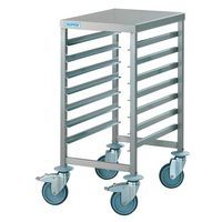 Wagen met geleiders van rvs 18/10. 7 niveaus met een ruimte van 75 mm. De profielen zijn aan elk uiteinde opstaand, als veiligheidsaanslag voor een goed behoud van de plateaus en roosters tijdens het gebruik. Uitgerust met 4 zwenkwielen, Ø 125 mm waarvan 2 met rem, van polyamide en met ronde schokdempers. Rvs wagen met geleiders voor gastronormbak