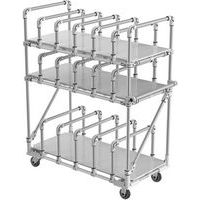 Wagen voor het transport en de presentatie van dozen en verpakkingen. Verticale opbergruimtes in aantal en positie verstelbaar. Modulaire structuur van aluminium, uitbreidbaar en verstelbaar. Uitgerust met 2 zwenkwielen en 2 zwenkwielen met rem. Gemaakt in de EU Max. belasting (kg) : 350 kg