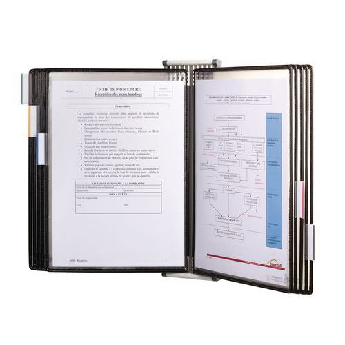 Antibacteriële muurset op spil voor het hygiënisch ter beschikking stellen van documenten. Hoes van natuurlijke organisch producten, zilverionen die ziektekiemen en bacteriën elimineren. Wandhouder met 4 pluggen om de hoezen te bevestigen en 5 ruitertjes voor hun indexering. Met 10 draaibare vakken van PVC Sterifold antimicrobieel met metalen spillen.