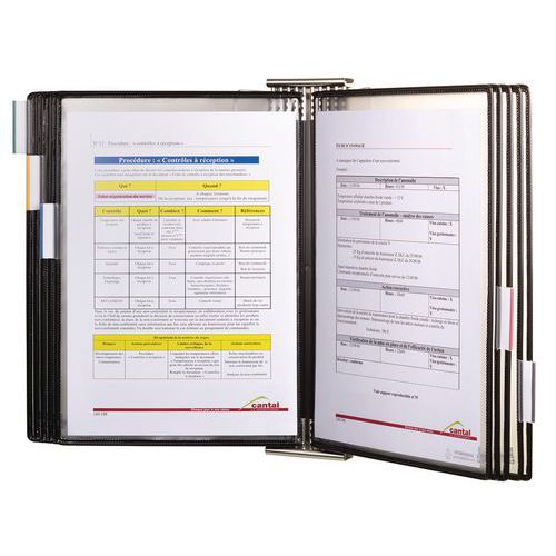 Antibacteriële muurset op spil voor het hygiënisch ter beschikking stellen van documenten. Hoes van natuurlijke organisch producten, zilverionen die ziektekiemen en bacteriën elimineren. Wandhouder met 4 pluggen om de hoezen te bevestigen en 5 ruitertjes voor hun indexering. Met 10 draaibare vakken van PVC Sterifold antimicrobieel met metalen spillen.