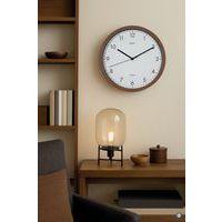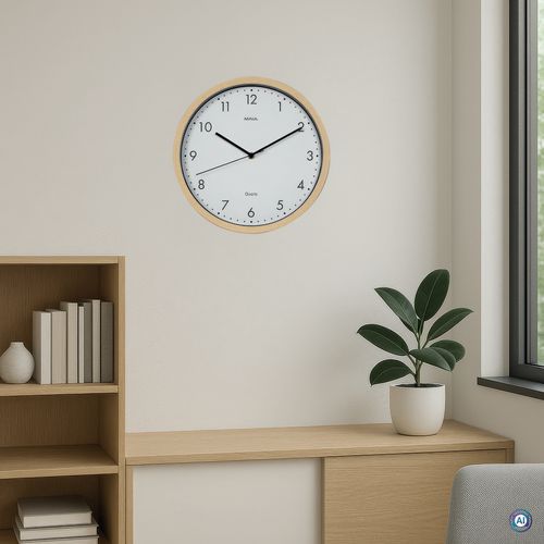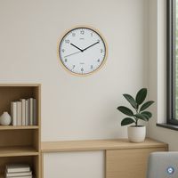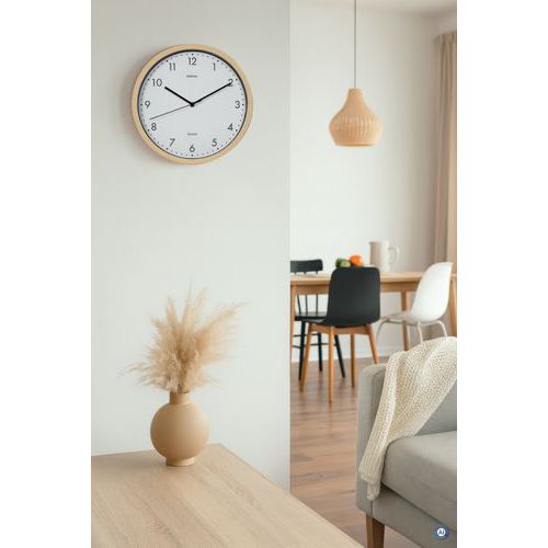 Moderne wandklok met een modern design en een warme uitstraling door de natuurlijke houtlook. Kwartsuurwerk. Elegant, klassiek en stevig ontwerp. Smalle rand, behuizing met houtlook, neutrale binnenkant in matzwart. Afdekking met plaat van mineraalglas. Voor moderne kantoren, representatieve ruimtes en gebruikers die waarde hechten aan stijlvol design.