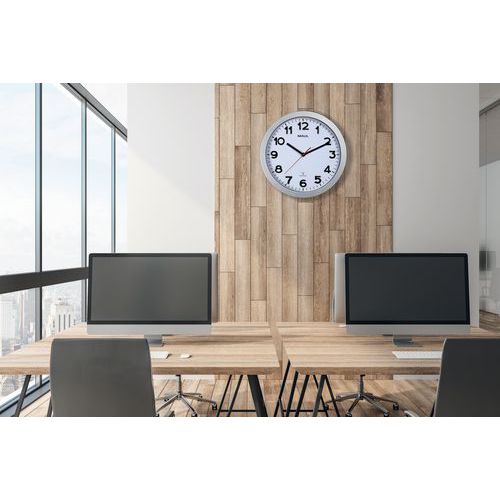 Het basismodel met een aangenaam design. Modern frame van stootvast kunststof, deksel van plat mineraalglas. Zeer goed leesbaar. Klassieke look voor kantoor of thuis. Automatische synchronisatie via het DCF77-signaal, automatische overgang van zomertijd naar wintertijd. Het bereik van het signaal is ongeveer 1500 km van de zender in Mainflingen. Er zijn storingen mogelijk door geologische omstandigheden of metalen constructies in gebouwen. In dat geval is een handmatige afstelling noodzakelijk.