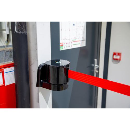 Wandhouder met afzetlint van 12 m voor afbakening over een grote afstand. Stabiele muurbevestiging om te schroeven, voor optimale ondersteuning. Maakt het mogelijk de toegang tot gevoelige gebieden en bouwplaatsen te beperken. Intrekbare band voor compact opbergen na gebruik. Geschikt voor industriële of logistieke omgevingen en evenementen.