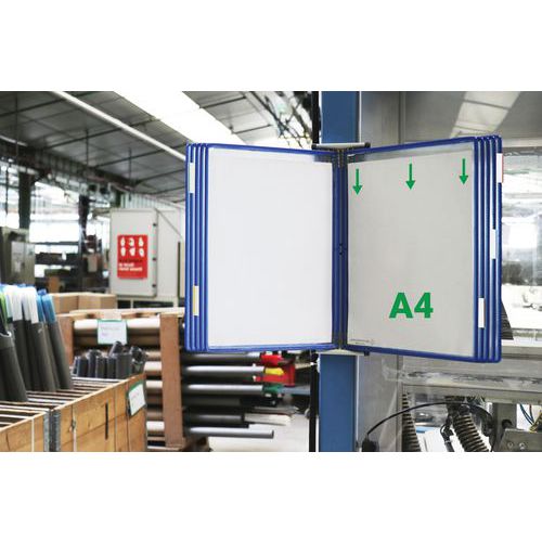 Wandsysteem magnetisch Tarifold A4, 10 zichtpanelen. Hij kan bijna overal worden gemonteerd, zonder gereedschap. De magnetische wandhouder kan in een oogwenk aan alle metalen oppervlakken worden bevestigd. Metalen wandgemonteerd documentpresentatiesysteem met zijstoppen en 10 A4 draaizakken. Krachtige magnetische strips op de achterkant Beschermt en organiseert al uw veelgebruikte documenten. Geeft directe toegang tot al uw belangrijke informatie. Speciaal bedoeld voor weergave in fabrieken, op machines, metalen wanden, enz. Voor het weergeven van instructies, procedures, telefoonboeken, catalogi, prijslijsten, enz. . De hoezen zijn voorzien van de originele, exclusieve Tarifold-technologie in staaldraad. Het systeem is traploos uitbreidbaar en past zich eenvoudig aan het volume van uw documenten aan. ecologische verpakkingen zonder plastic Circulaire economie: geretourneerde oude tassen worden gerecycled!
