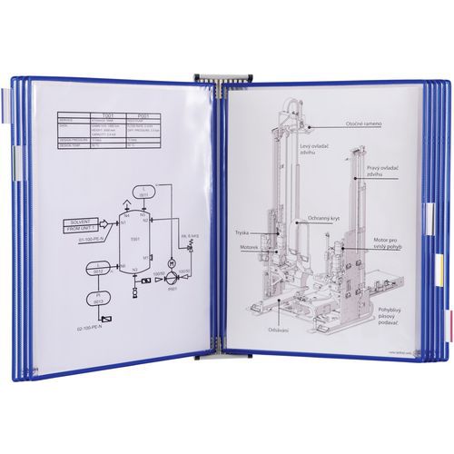Wandsysteem metaal Tarifold A3, 10 zichtpanelen zijopening. Metalen presentatiesysteem voor documenten aan de muur met zijstoppen en 10 draaibare A3-vakken. Beschermt en organiseert al uw veelgebruikte documenten. Geeft onmiddellijke toegang tot al uw belangrijke informatie. Voor gebruik in fabrieken, supermarkten, magazijnen, kantoren, restaurants, winkels, etc. Voor het weergeven van instructies, procedures, adresboeken, catalogi, prijslijsten enz. De hoesjes zijn voorzien van de originele, exclusieve Tarifold staaldraadtechnologie. Het systeem is traploos uitbreidbaar en kan eenvoudig en eenvoudig worden aangepast aan het volume van uw documenten. Geleverd in ecologische plasticvrije verpakkingen Circulaire economie: oude geretourneerde tassen worden gerecycled! Gemaakt in de EU Klantgarantie : 10 jaar