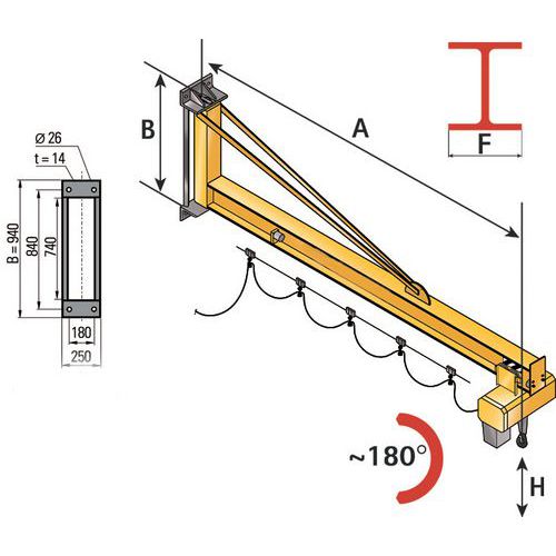 De hefarm kan gemakkelijk handmatig worden verplaatst (lichte constructie, classificatie conform EN 13001 HC2 S2 HD2). Groot bereik en verhoogd hefvermogen. Gedeeltelijke rotatie van 180°. Zwenkt op ringen met een lage wrijvingscoëfficiënt of op rollen, afhankelijk van de belasting, voor een soepele verplaatsing van de zwenkarm. Afwerkingslaag voor binnen, korrelstructuur en lak RAL 1007 narcissengeel (dikte 80 µm).